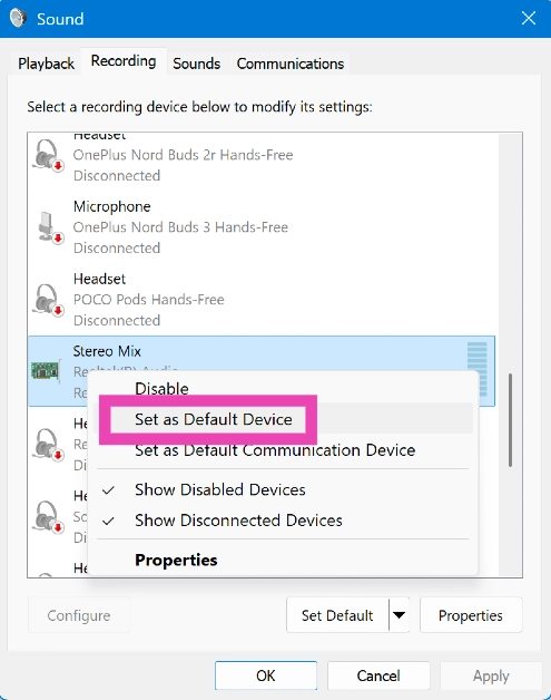 ステップ7:ステレオミックスをもう一度右クリックして選択しますデフォルトのデバイスとして設定します。