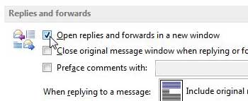 - を確認してください新しいウィンドウで返信と転送を開きます箱。