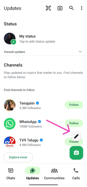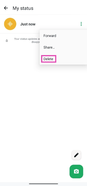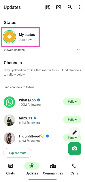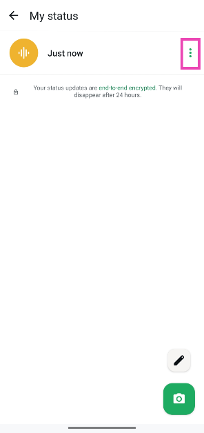 行きますwhatsapp>更新、鉛筆アイコンをタップし、マイクのアイコンを長時間押して音声ノートを記録します。ボイスノートを終了するためにアイコンをリリースし、「送信」キーを押してステータスとして投稿します。