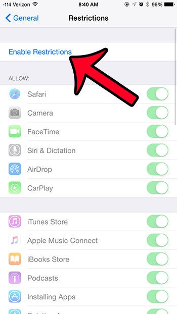 ステップ4:青をタップします制限を有効にします画面の上部にあるボタン。