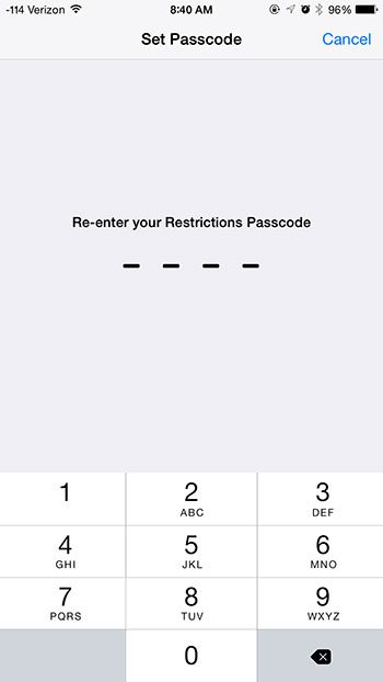 ステップ5:制限メニューの設定に将来の変更を行うために必要なパスコードを作成します。