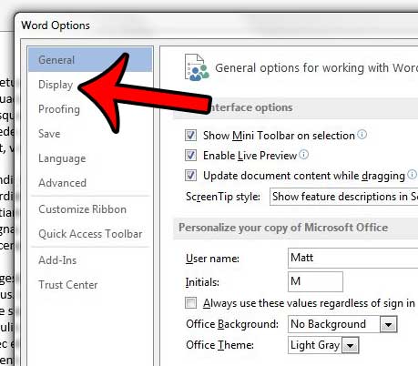 ステップ4:クリックします画面の左側のタブ単語オプションウィンドウ。