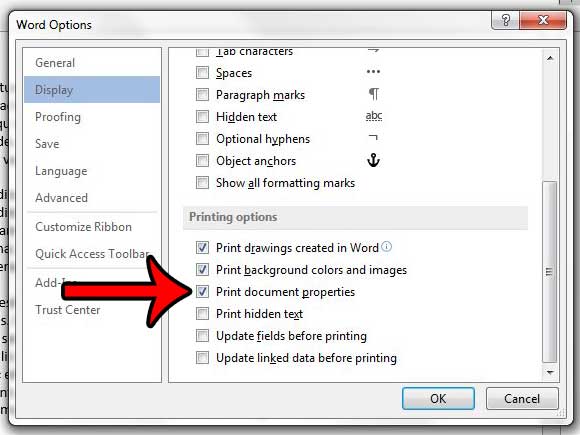 ステップ5:下にスクロールします印刷オプションメニューのセクション、の左側のボックスを確認しますドキュメントプロパティを印刷します、次にクリックしますわかりましたウィンドウの下部にあるボタン。