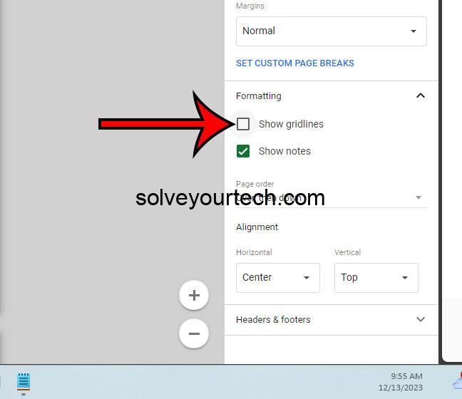 「印刷」設定では、「フォーマット」セクションを探して、「Gridlinesを表示」の横にあるボックスのチェックを外します。