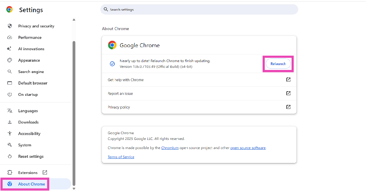 ステップ4:Google Chromeが開始されます更新自動的に。クリックしてくださいリニューアル更新を完了します。