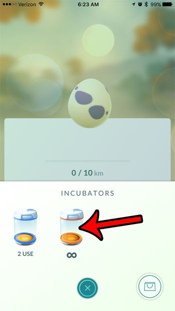 ステップ7:使用するインキュベーターをタップします。インキュベーターを以前に購入したことがない場合、またはレベルアップの報酬としてインキュベーターを取得した場合、オレンジインフィンテインキュベーターのみがある可能性があります。