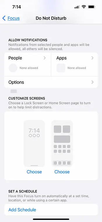 あなたはあなたのiPhoneを、行くことによってモードを邪魔しないでください設定>フォーカス>邪魔しないでください>そして、オプションを構成します。