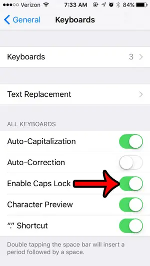 ステップ4:右側のボタンをタップしますキャップロックを有効にします電源を入れます。ボタンが有効になったら、ボタンの周りに緑色のシェーディングが必要です。下の写真では、キャップロックが有効になっています。