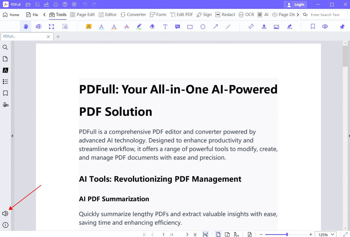 ステップ3 - テキストからスピーチのアクティブ化:pdfullでは、をクリックしてTTS関数をアクティブにすることができますサウンドアンプアイコンインターフェイスの左下隅。アクティブ化されると、PDFULLはPDFのコンテンツを自動的に読み上げ始めます。