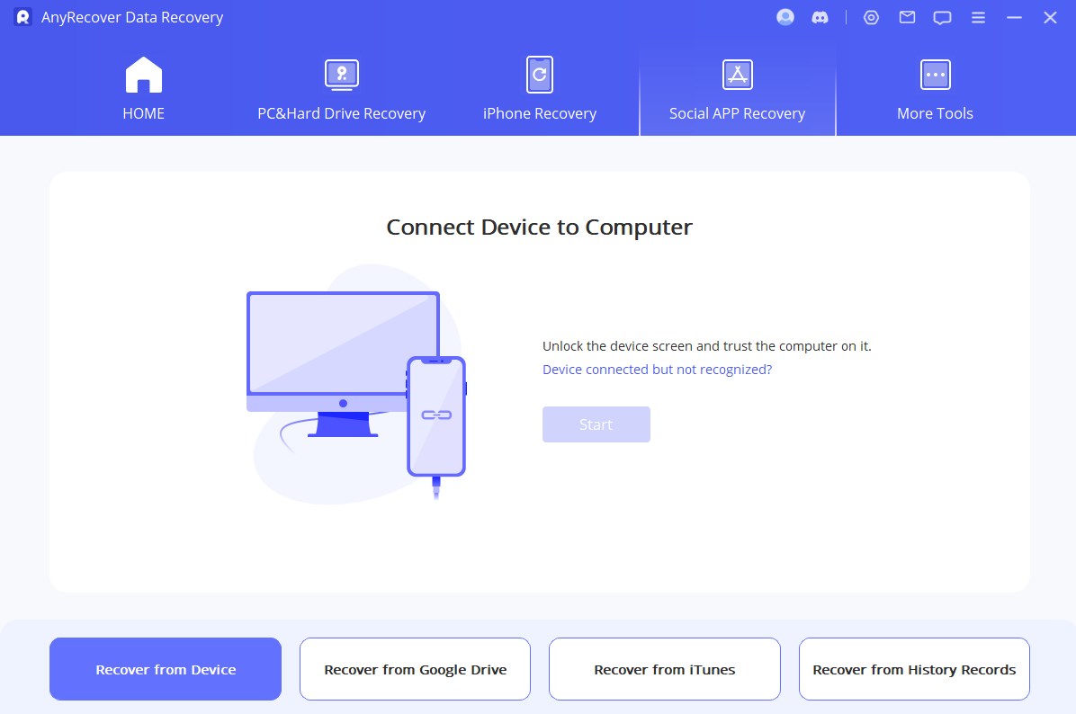 これで、ソフトウェアはデータを回復する場所から複数のオプションを表示します。あなたの場合は、をクリックするだけですデバイスから回復しますオプション。この後、モバイル/デバイスをコンピューターに接続し、モバイルからソフトウェアを信頼します。をクリックします始めるボタン。