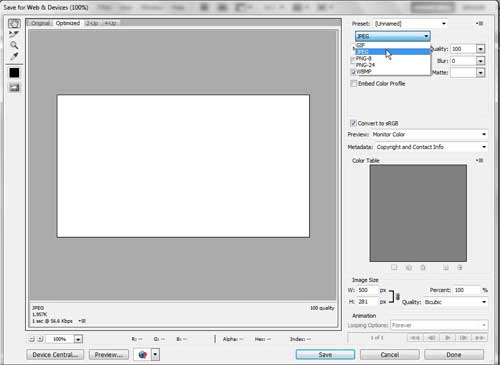 使用することもできますWeb&Devicesを保存しますのオプションファイルメニューは、画像の寸法と解像度を指定したら。