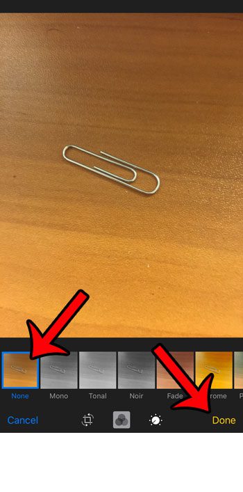 - フィルターのリストの左側までずっとスクロールしてから、なしオプション。タップします終わり終了したら、画面の右下隅にあるボタン。