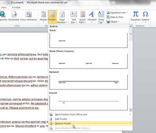クリックしますフッターのドロップダウンメニューヘッダーとフッターリボンのセクション、次にクリックしますフッターを取り外しますメニューの下部にあるボタン。