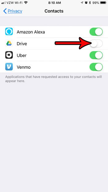 ステップ4:連絡先を削除するアプリの右側のボタンをタップします。下の写真で、Googleドライブアプリの連絡先権限を削除しました。