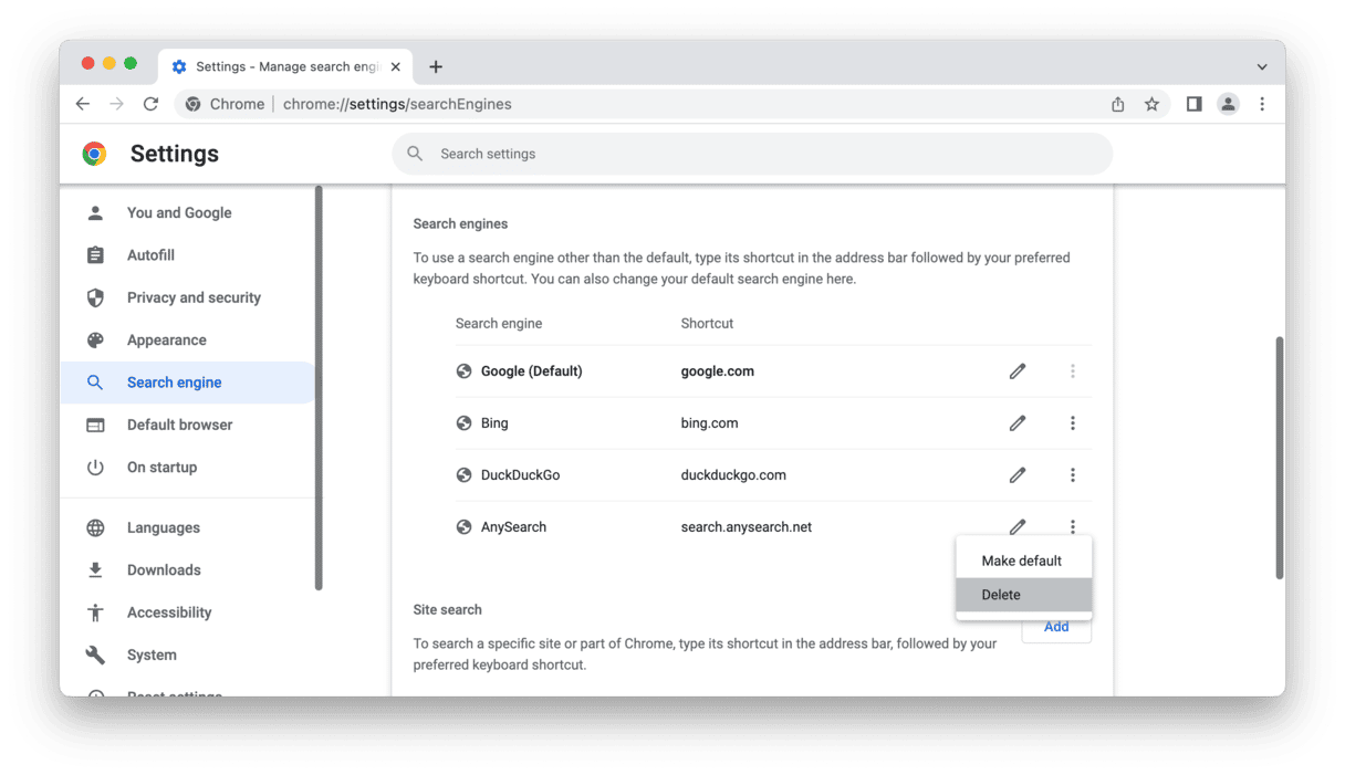 - [検索エンジンの管理]をクリックし、任意の検索エンジンの横にあるボタンをクリックし、[削除]を選択します。
