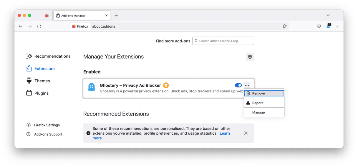 about:addons検索バーとプレスリターンで。 - 削除する拡張機能の3ドットアイコンをクリックします。