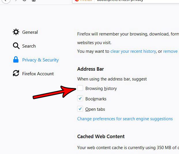 ステップ5:左側のボックスを確認します閲覧履歴の下アドレスバーメニューのセクション。