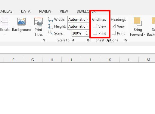 - を見つけますグリッドラインリボンのセクション、次に、からのチェックマークを削除しますビューそして印刷必要に応じてボックス。