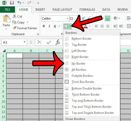 グリッドラインをオフにした後も細胞の周りに現れている線がまだある場合、実際には代わりに細胞の境界があるかもしれません。境界のある細胞を選択して、家ウィンドウの上部にあるタブ、次にクリックします境界のボタンフォントリボンのセクションと選択国境はありませんオプション。
