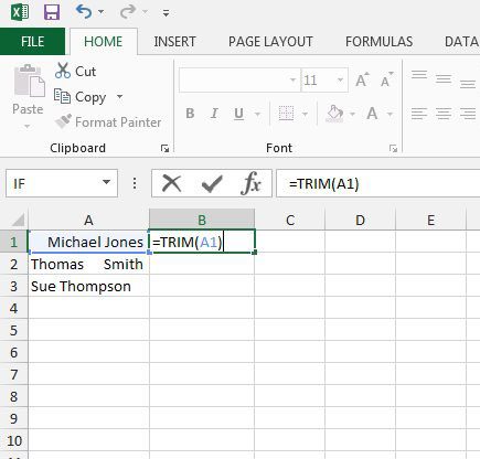 ステップ3:式を入力します=トリム(xx)どこxxトリミングするデータの場所です。下の画像では、これはセルですA1。