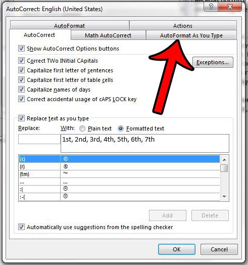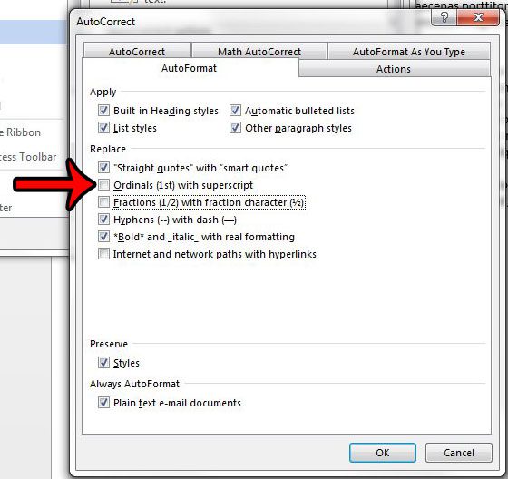 ステップ6:左のボックスをチェックします上付き文字を備えた序数(1番目)。左側のボックスをクリックすることもできます分数文字(1/2)の分数(1/2)そのフォーマットも停止します。クリックしますオートフォーマット[次へ]タブ。