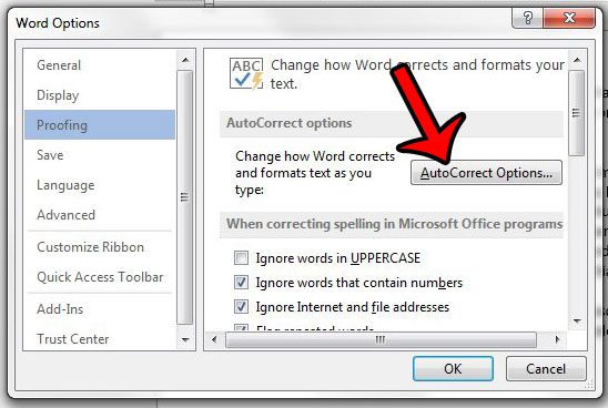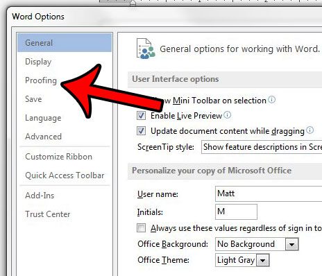 ステップ3:クリックします校正の左列に単語オプションウィンドウ。