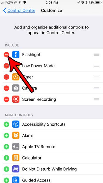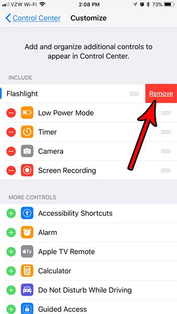 ステップ5:タッチします取り除く懐中電灯の右側にあるボタンは、コントロールセンターから削除します。