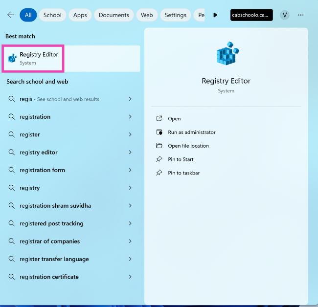 ステップ1:を使用します検索ボックスタスクバーでレジストリエディターを見つけます。