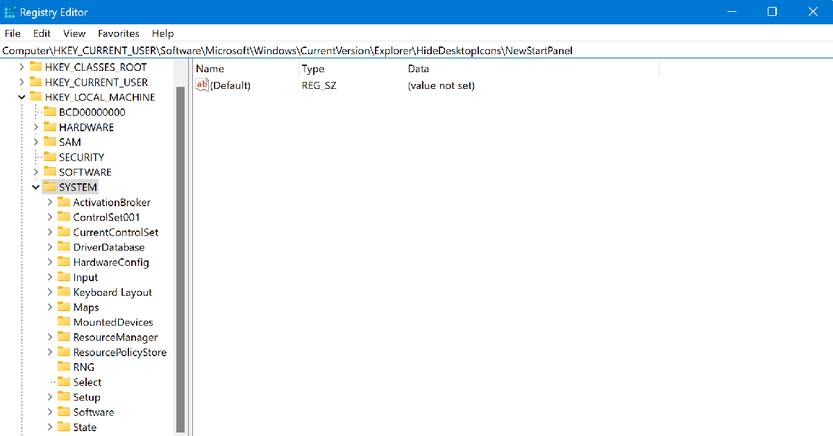ComputerHKEY_CURRENT_USERSOFTWAREMIGROSOFTWINDOWSCURRENTVERSTIONEXPLORERHIDEDESKTOPICONSNEWSTARTPANEL