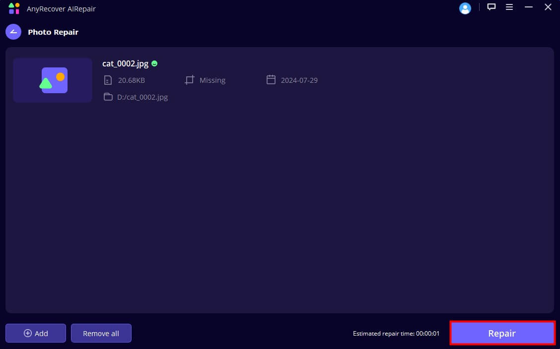 ステップ2:修理したい古い写真または破損した写真を選択してください。一度に複数の写真を選択できます。写真がアップロードが完了するのを待ち、「」をクリックします。修理修理プロセスを開始するボタン。