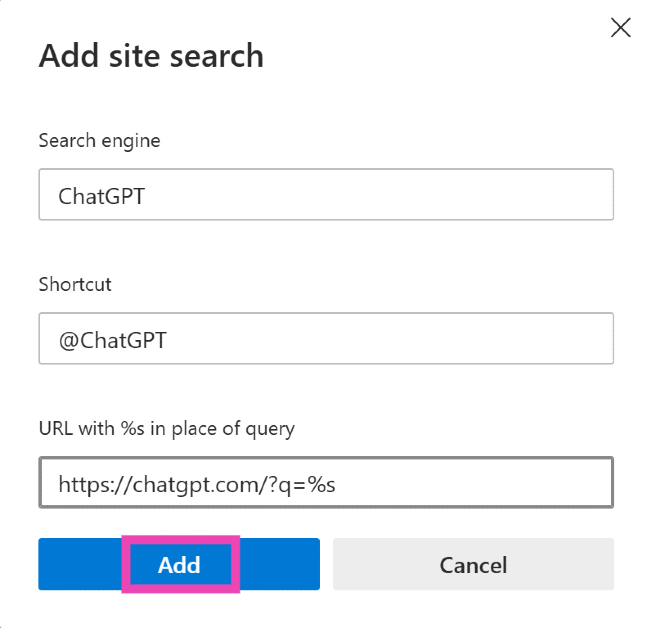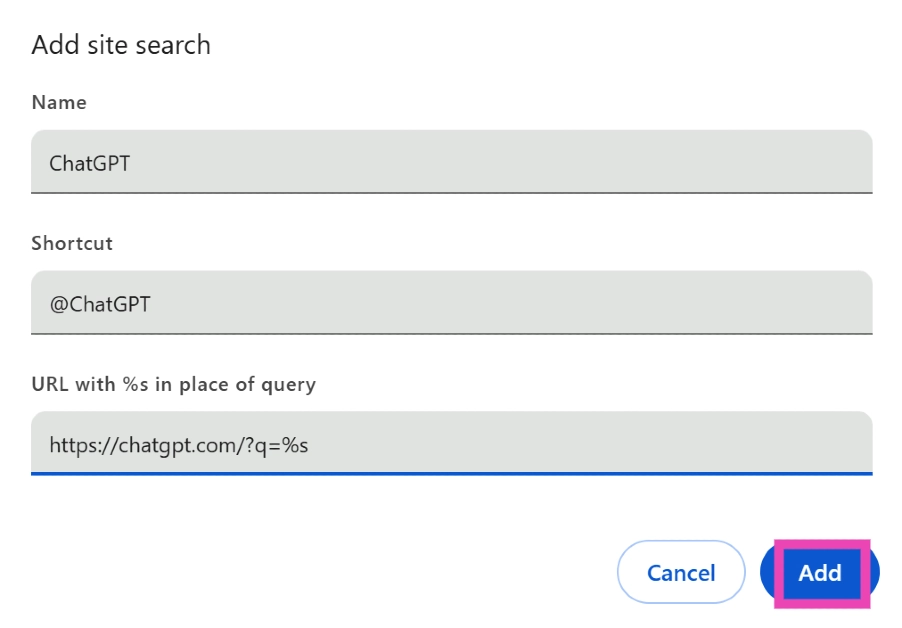 ステップ7:でURLテキストボックス、 入力https://chatgpt.com/?q=%S。
