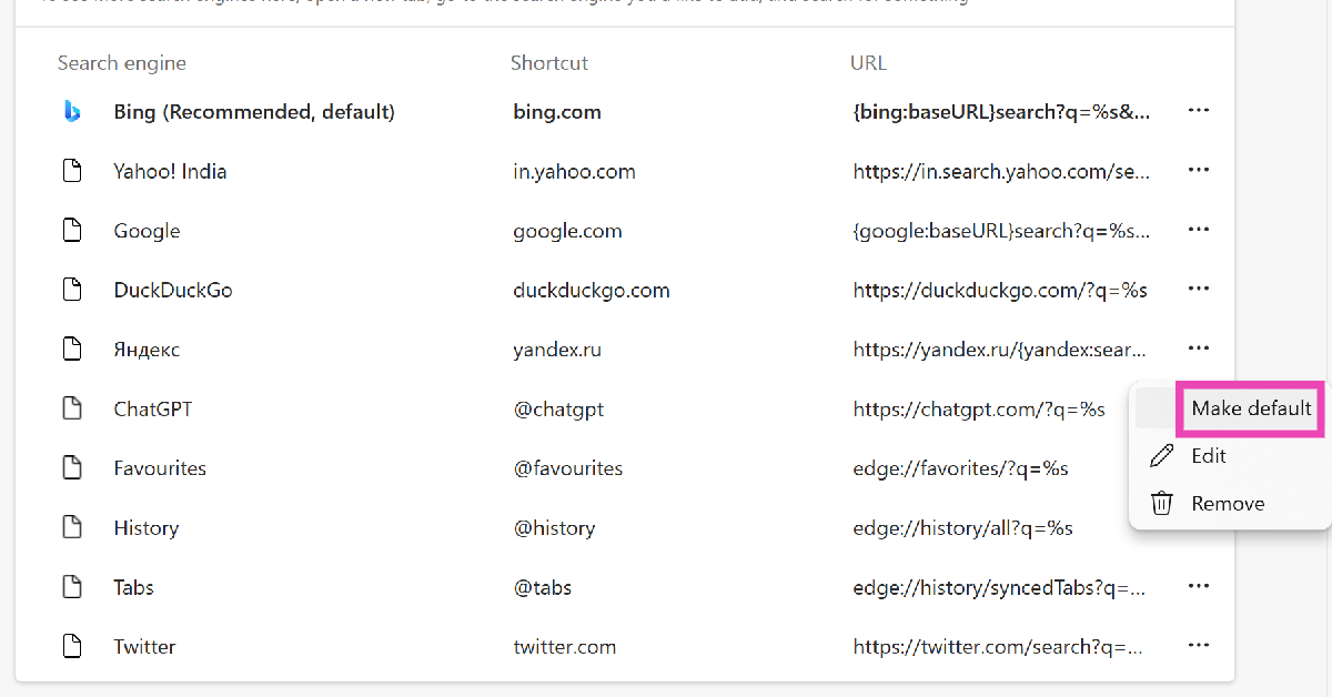 ChromeのChatGPT検索拡張機能を使用して、検索バーに直接アクセスできます。 Microsoft Edgeを使用する場合、ChatGptをデフォルトの検索エンジンとして設定することで、設定>プライバシー、検索、およびサービス>アドレスバーと検索>検索エンジンの管理>追加、およびURLテキストボックスにhttps://chatgpt.com/?q=%Sを入力します。それが完了したら、エントリの横にあるエリップスをクリックして、[デフォルトを作成]を選択します。