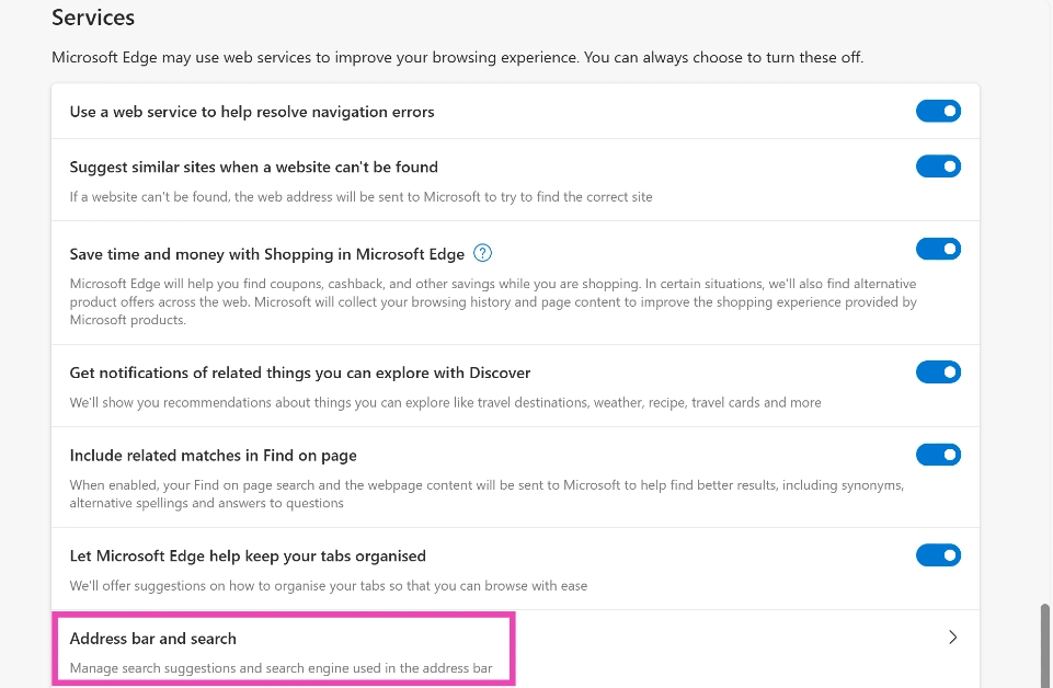 ステップ3:下にスクロールしてクリックしますアドレスバーと検索。