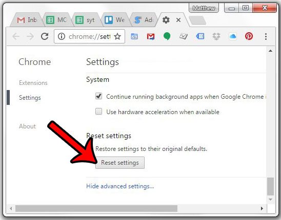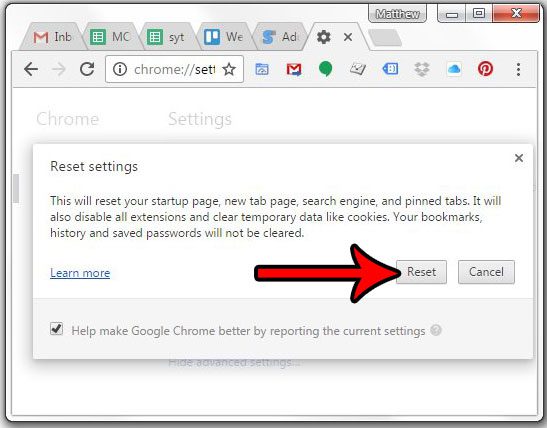 私たちのガイドは、これらの手順の写真を含むデフォルト設定にChromeをリセットする方法に関する追加情報を以下に続けます。