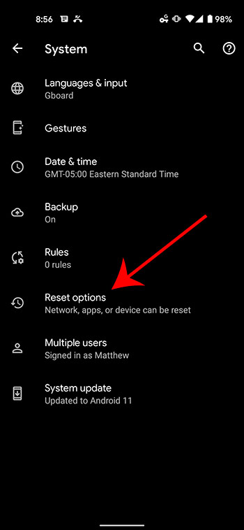 幸いなことに、Pixel 4Aの設定メニューには、さまざまな種類のリセットを実行できるセクションがあります。これらのリセットの1つを使用すると、ピクセルのネットワーク設定をすばやく完全にリセットできるため、アクションを再度実行して実行できるかどうかを確認できます。