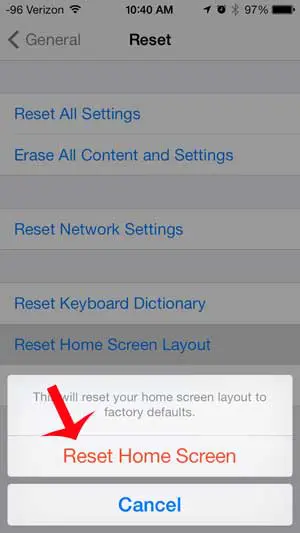 ステップ5:赤に触れますホーム画面をリセットしますiPhoneアイコンをリセットすることを確認するボタン。