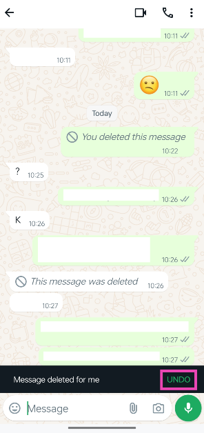 WhatsAppを使用すると、メッセージの削除を最大5秒間元に戻すことができます。このオプションは、削除を押すとすぐに画面の下部にポップアップとして表示されます。自分で削除するメッセージでのみ利用可能であるため、最初からそれがあなたの意図であった場合、それらを持ち帰って削除する方法があります。