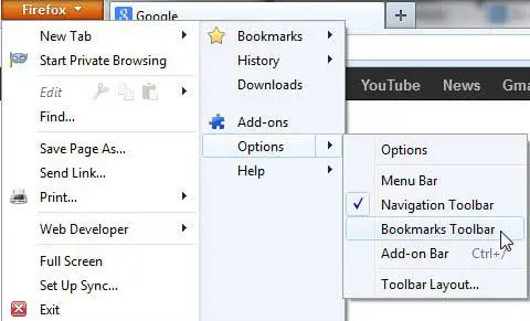 ステップ3:クリックしますオプション、クリックしますブックマークツールバー。