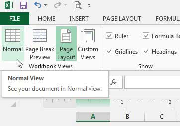 Excel 2013の通常のビューは、プログラムがデフォルトで開くものです。これにより、スプレッドシートにセルのみが表示されます。ヘッダーとフッターは表示されず、ページが壊れるのも表示されません。