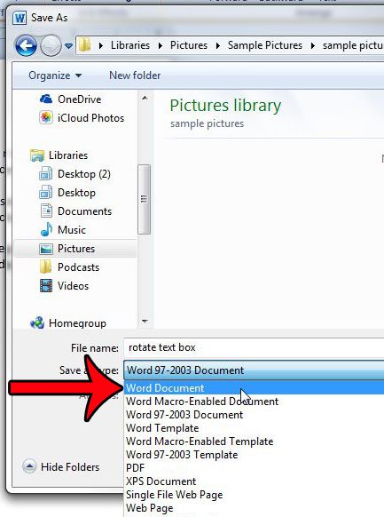 このメソッドは、.docxファイル拡張子を使用した単語ファイルに対してのみ機能することに注意してください。 .doc拡張機能を備えたファイルは、回転したテキストボックスをサポートしません。以下に参照されている緑のハンドルが表示されない場合は、ファイルが.docファイル形式に保存されている可能性が非常に高いです。クリックしてこれを修正できますファイル- >ASを保存します- >次のドロップダウンメニューをクリックしますタイプとして保存します、リストの上部にあるWord Documentオプションを選択します。