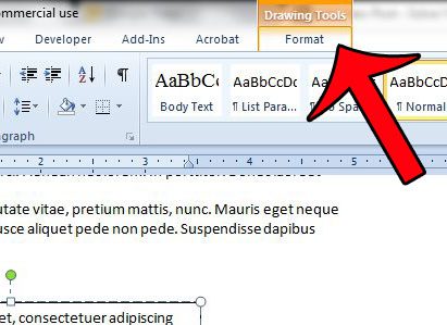 テキストボックスの内側をクリックして、クリックすると、テキストボックスを回転させることもできます。形式ウィンドウの上部、下のタブ描画ツール。