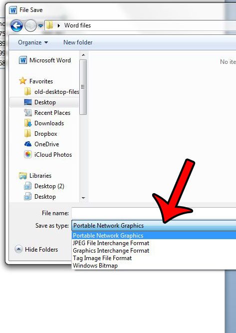 - ステップ4:ファイルを保存する場所を選択し、右側のドロップダウンメニューをクリックしますタイプとして保存します、および画像ファイルタイプを選択します。必要なファイルのタイプがわからない場合、最も安全な選択は通常、ポータブルネットワークグラフィックス(.png)またはJPEGファイルインターチェンジ形式(.jpg)です。これらは他のほとんどのプログラムで簡単に使用できるためです。
