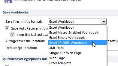 これらの個人については、Excel 2010でデフォルトでXLSファイル形式に保存し、Excel 2003以前を使用している人が誤って開くことができないファイルを作成しないようにするためのより良いソリューションがあります。幸いなことに、このソリューションはいくつかの短いステップで実装できます。