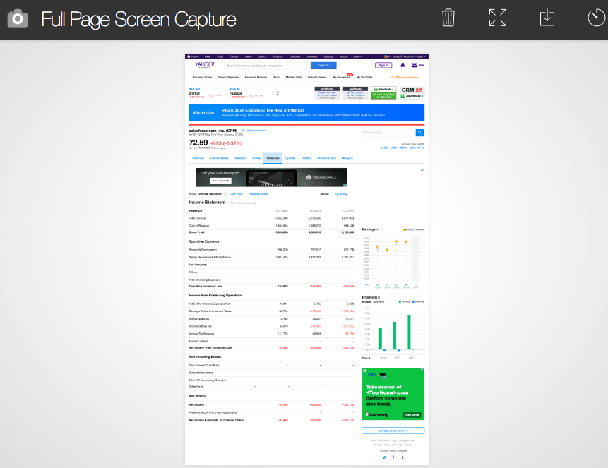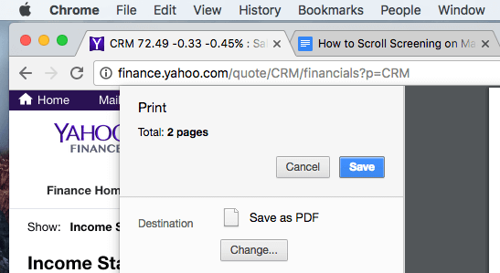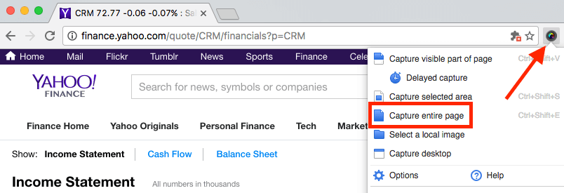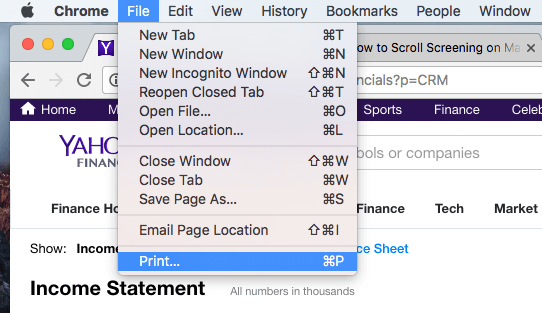 たとえば、Yahoo Financeからの損益計算書シートを抽出したいとします。まず、Webブラウザでページを開きます。ここでは、例としてMacでChromeを使用しています。