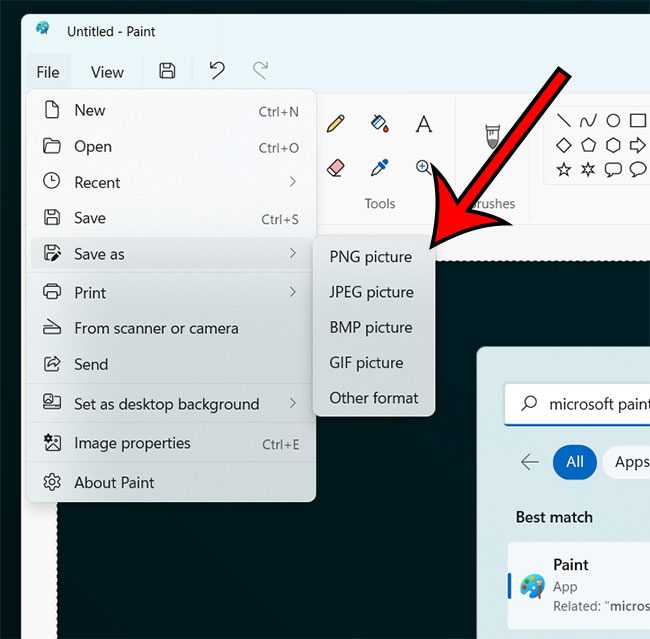 画像を貼り付けて調整を行ったら、ファイルペイントウィンドウの上部左側にタブを付け、「保存」を選択し、次のファイルタイプのいずれかを選択します。