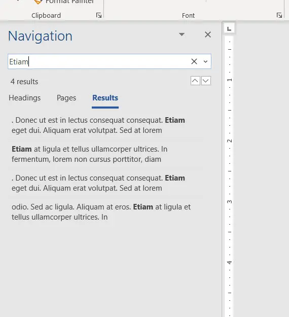 次に、ドキュメントに表示される単語の各インスタンスを強調表示し、ナビゲーション列の各検索結果をクリックして、ドキュメント内のその単語の発生にジャンプすることができます。