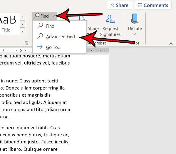 他のオプションに使用できる[そのセクションの[検索]ボタンの右側に下にある矢印があることに注意してください。たとえば、があります高度な発見のオプション探す追加の検索オプションに使用できるドロップダウンメニューは、ドキュメント内の特定の単語または単語を見つけることができます。