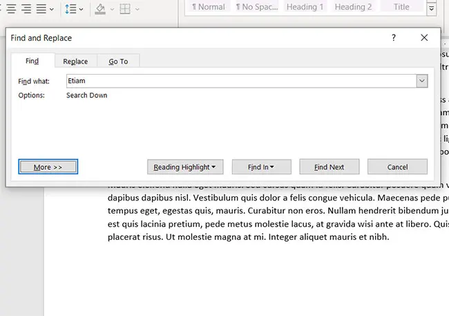 - Microsoft Wordの古いバージョンを使用している場合は、単語を検索しようとしたときに以前に表示されたダイアログボックスに使用される場合があります。ナビゲーションペインは基本的な検索ツールに置き換えられましたが、ドロップダウンメニューから[詳細]オプションを選択した場合、そのダイアログボックスが表示されます。