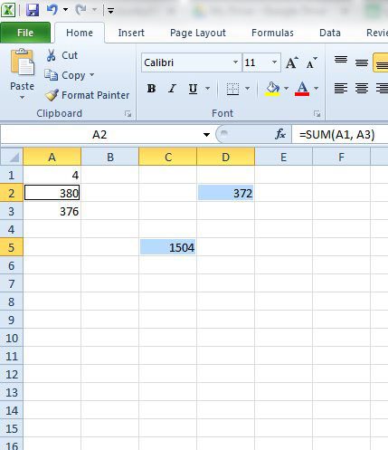 Excelは、スプレッドシートの最初の式を自動的に選択し、フォーミュラを含む残りのセルが青で強調表示されます。たとえば、下の画像では、セルA2、C5、 そしてD2すべて式が含まれています。フォーミュラA2最初に表示されるために選択されます。ハイライトされたセル間で、入力キーボードのキー。