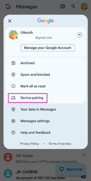 ステップ2:ヒットしますプロフィールアイコン画面の右上隅で選択しますデバイスペアリング。